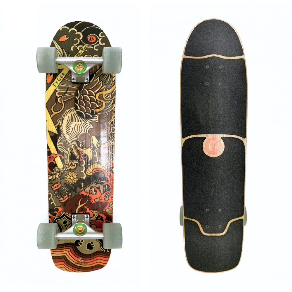 La Tygua (águila en lengua Chibcha) rinde homenaje a los skateboards del final de los 80’s con su diseño amplio, tail y nose funcionales y un cóncavo sutil que brinda estabilidad y control. Su construcción en guadua laminada refuerza la resistencia y suavidad de conducción, convirtiéndola en la opción ideal para bowls, transiciones y pump tracks. Perfecta para riders grandes que buscan comodidad sin sacrificar rendimiento. Su arte, creado por el tatuador caleño Jhonny Vital, fusiona la cultura del skate con una estética asiática única.